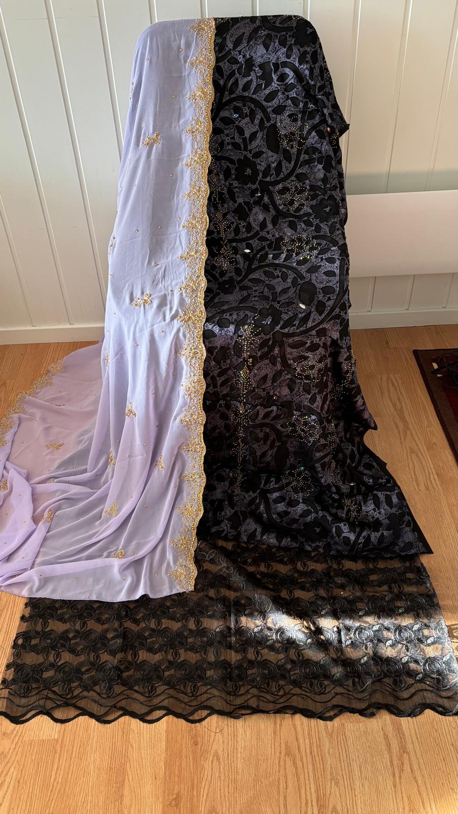 This luxurious two-piece textile ensemble captivates with its striking contrast and lavish detail. A graceful panel of soft lavender crepe, flowing and smooth to the touch, is bordered by an elaborate cascade of golden beadwork and embroidery, adding a touch of regal opulence. Paired with it is an exquisite black lace, layered with a shimmering, velvet-like jacquard pattern of floral and leaf motifs. This dark fabric is further enriched with scattered iridescent sequins in hues of green and gold, which catch the light and provide a subtle, enchanting sparkle. The combined texture and embellishments make this set an ideal choice for crafting a sophisticated evening gown or a distinctive cultural garment.
